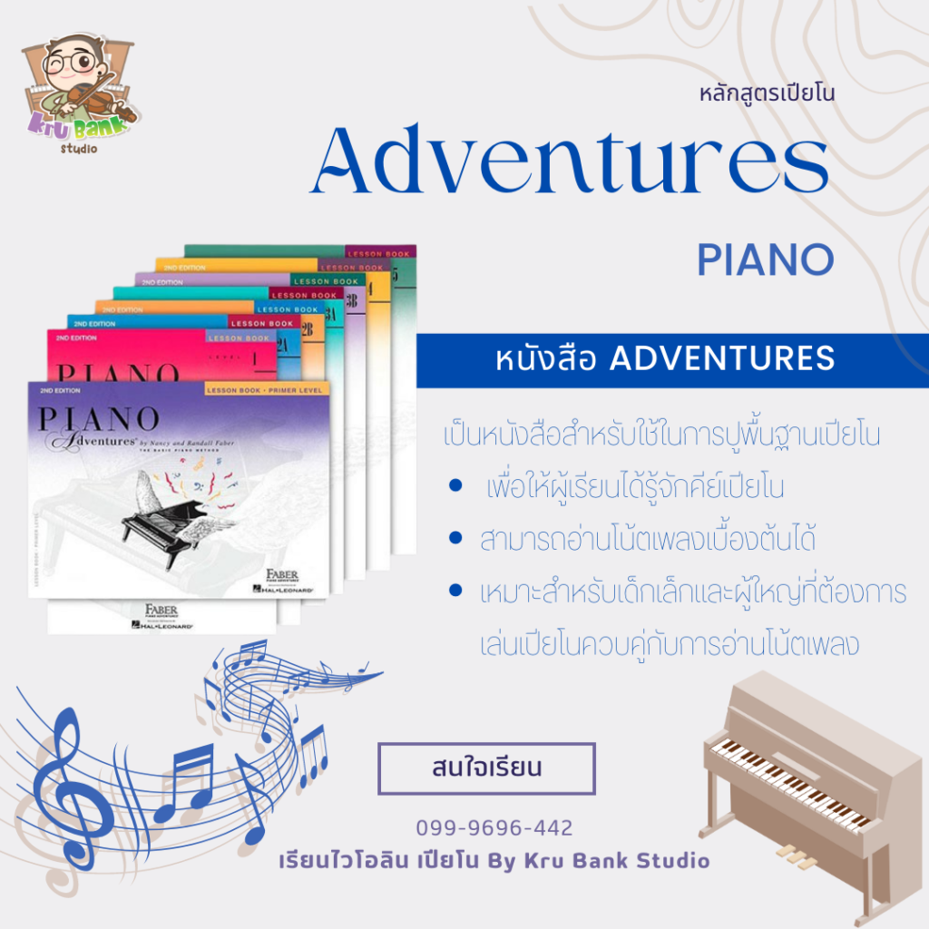 โดยหนังสือ Adventures เป็นหนังสือสำหรับใช้ในการปูพื้ฐานเริ่มต้นเพื่อให้ผู้เรียนได้รู้จักคีย์เปียโนและสามารถอ่านโน้ตเพลงในเบื้องต้นได้
